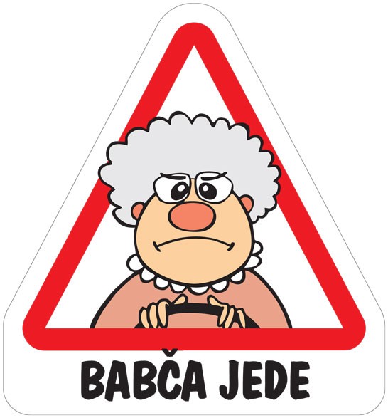 Značka Babča jede vtipně poukazuje na „starší“ řidičku.