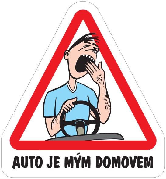 Značka Auto je mým domovem vtipně poukazuje na „unaveného“ řidiče.